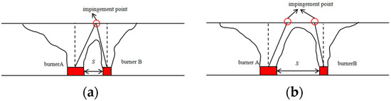 Schematic of the position of impingement point for cases of (a) small spacing and (b) large spacing.