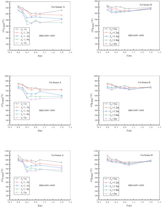 Figure 6 shows the maximum temperature change under different fire source spacings (∆Tmax = Tmax − T∞), and T∞ is expressed as the ambient temperature. From the figure, it can be seen that ∆TA-max first reduces and then increases when S is increasing. ∆TB-max exhibits a same variation trend with the increase in S as the variation of ∆TA-max. When the two fire sources distance reaches a threshold, the interaction of two fires decreases, and the MT rise does not change with the increase in fire spacing. When the spacing between two fire sources is small, the air entrainment of the plume is limited [38]. As the distance increases, the air entrainment of the fire plume is enhanced, which results in a temperature decrease. In cases when the distance between two fire sources is small, the flame plumes tilt inward. As the distance increases, the tilt angle gradually decreases, and eventually the flame burns vertically, which could be the reason for the above mentioned subsequent increase in the maximum temperature rise.
