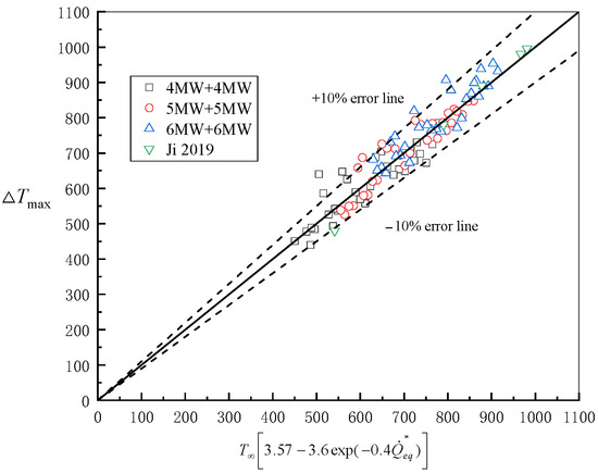 Figure 7 illustrates the association between the MT (∆Tmax/T∞) and the dimensionless fire source power. It is evident from the figure that all data points are densely distributed. By performing a nonlinear fitting of the data, a predictive model for the MT below ceiling is obtained as shown in Equation (14):