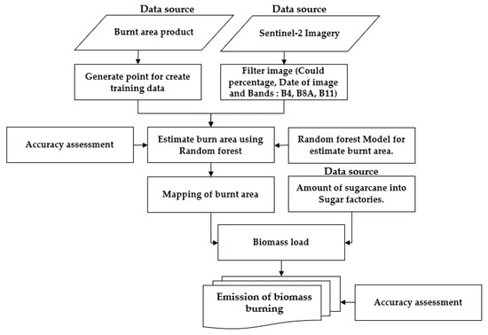 Therefore, this study attempts to reduce uncertainty by integrating high-spatial-resolution satellite imagery and Sentinel-2 imagery to estimate the emissions of air pollutants from open biomass burning related to forest fires and agriculture waste residues. Furthermore, it also assesses the amount of air pollutants emitted from the agro-industry, which corresponds to the large amount of agricultural land in the study area. This assessment is conducted through an emission inventory (EI), which is useful and the standard method for reporting the number of air pollutants in each category of interest [25,26]. The EI in these studies focuses on PM1, PM2.5, PM10, NOX, SO2, black carbon (BC), and organic carbon (OC), estimated based on the amount of burned biomass. Moreover, the amount of burned biomass is assessed in the burned area, obtained from the assessment of Sentinel-2 images using the machine learning (ML) technique and processing in the GEE platform. Finally, the air emissions obtained from these studies are compared with AOD and other air pollutants obtained from Sentinel-5P to validate the results.
