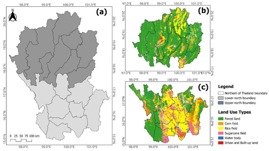 (a) The study area located in northern Thailand. (b) The upper-north boundary. (c) The lower-north boundary.