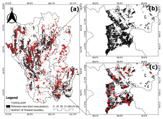 (a) Example of map of burned polygons and training data points over the study area. (b) A close view of the black box shown in (a,c). A close view of the black box shown in (a) with the training data point.