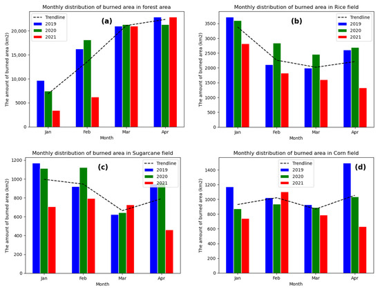 The monthly distribution of burned area during haze episodes in 2019–2021: (a) forests, (b) rice plantations, (c) sugarcane plantations, and (d) corn plantations.