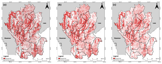 The Spatial distribution of the burnt area in northern Thailand during haze episodes: (a) 2019, (b) 2020, and (c) 2021.