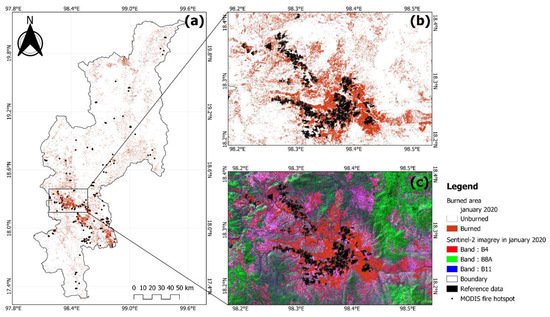 Example of map of burned in January 2020 in Chiang Mai. (b) A close view of the red box shown in (a,c). A close view of the red box shown in (a) with Sentinel-2 imagery (B4, B8A, and B11).