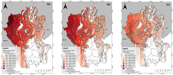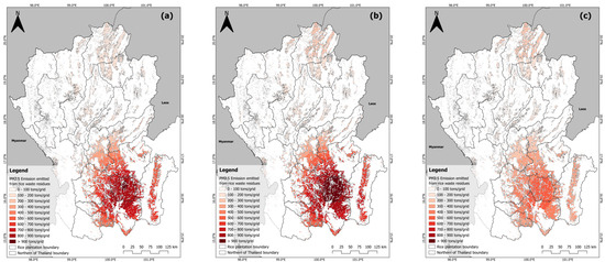 The spatial distribution of the gridded PM2.5 emissions emitted from rice waste residues: (a) 2019, (b) 2020, and (c) 2021.