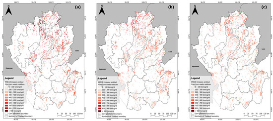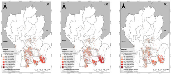 The spatial distribution of PM2.5 emissions from open biomass burning (grid size 1 km × 1 km) is shown in Figure 7, Figure 8, Figure 9 and Figure 10. Figure 7a–c shows that the upper-north region emitted the highest PM2.5 emissions from forest fires, primarily due to its extensive forest cover, encompassing approximately 64.9% of the upper-north area. This correlation between high emissions and significant forest cover is notable in provinces such as Mae Hong Son, Chiang Mai, and Tak, where the distribution of PM2.5 can be found at concentrations ranging from 5000 to 6000 tons/grids. Conversely, the lower-north region had heightened PM2.5 emissions from burning crop residue; notably, the burning of rice waste, particularly in Sukhothai, Kamphaeng Phet, Phitsanulok, and Nakhon Sawan, contributed to a higher density of PM2.5 emissions, with the year 2020 featuring the highest density, with PM2.5 emissions reaching approximately 600–700 tons/grids (Figure 8a,b). These provinces, characterized by lowland areas conducive to rice cultivation, have rice as a primary economic crop. Similarly, the burning of sugarcane wastes indicates a high density in provinces such as Nakhon Sawan, Kamphaeng Phet, Uthai Thani, and Phetchabun, with Phetchabun showing the highest density at approximately 1000–1200 tons/grids (Figure 9a–c). Notably, over 90% of harvested sugarcane products are sent to sugar factories—a trend attributed to the proximity of sugarcane plantations to these factories, influencing the burning activities in sugarcane plantations to meet factory demands. Furthermore, PM2.5 emissions from corn waste residues are notably higher in provinces such as Nan, Chiang Rai, and Lampang compared to other regions, as evidenced in Figure 10a–c. The upper-northern region has a significant presence of corn residues, extending into areas without extensive irrigation systems, as corn cultivation thrives in these regions due to its ability to grow with minimal water requirements. Although the density of burning corn waste is lower than rice and sugarcane waste residues, it continuously impacts regional air quality.