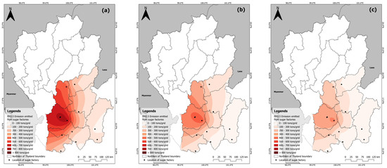 Agro-industries, notably sugar plants, contribute to pollution by burning biomass. Thailand’s second-largest sugarcane cultivation area is 169,644.3 km2. Fresh and charred sugarcane exist. Sugar plants create power for boilers and other industries with harvested sugarcane. Bagasse, a byproduct of juice extraction, can be transformed into renewable energy for production heating [23,24]. Sugarcane bagasse is used to generate steam in the boiler furnace after juice extraction for manufacturing. Industrial air pollutants might also be released during this process, affecting air quality. There are 13 sugar factories in the study area, and they are mainly allocated in the lower north of the region, which supervises the OCSB in Thailand. The amount of emissions from sugar factories was proposed by an estimation method developed by Sahu et al. (2015) [49], as detailed below: