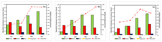 Spatial and temporal emissions from air pollution sources in Thailand have been poorly investigated, and there are numerous methods to assess them. Emission inventories were popular for reporting pollution levels due to their speed and cost [25]. Current worldwide products employing sensors with varying spatial resolutions, such as MODIS (250 m–500 m), especially the burned area product (MCD641, FIRECCI, MCD451, etc.), are popular for estimating air pollutant emissions from open biomass burning, especially in forest fire zones [5,26,27,28]. These tools may not detect tiny fires or burned areas smaller than 1 km2, even though they generate air pollution that can affect land use [29]. Some studies have used fire hotspots to estimate burning areas, including air pollutant emissions from agricultural waste residues that evaluate agricultural production yield [30,31,32], but this may introduce uncertainty.