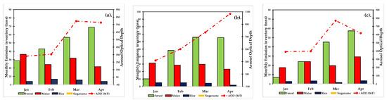 The total burned area over the dry seasons from 2019 to 2021 amounted to roughly 153,735.2 km2. In 2019, the burned area peaked at 88,465.3 km2, accounting for 51.4% of the study area. Of this, 69,753.9 km2 (78.8%) was from forest fires, while 18,711.4 km2 (21.2%) was from agricultural areas. In 2020, the following areas were discovered: 87,332.4 km2 or 50.8% of the study area was affected by forest fires, with 68,166.4 km2 or 78.1% of the forest area and 19,165.4 km2 or 21.9% of the agricultural area being affected. In 2021, the burned area was the smallest, at 63,500.2 km2, which accounted for 33.8% of the study area. Of this burned area, 69,753.9 km2 (82.4%) originated from forest fires, while 13,534.0 km2 (27.6%) originated from agricultural regions. The burned area is displayed in Table 4. Figure 4 shows the monthly distribution of burned areas during dry seasons in northern Thailand. It was found that forest fires had been occurring since January, and the peak period was in March–April, as shown in Figure 4a. On the other hand, the burning of agricultural waste is indicated by an uncertain burning period due to variations in planting and harvesting schedules. Especially in the rice plantation, as shown in Figure 4b, the burning area was particularly high in January, which coincides with the harvest seasons, which peaks from November. The burning of corn and sugarcane residues in the field indicated a similar time series, as shown in Figure 4c,d. The burned area remained relatively constant over 5 months (December–April), with the peak harvesting period for corn occurring from October to December, aligning with the cold dry season. Similarly, in sugarcane plantations, which can be harvested during the cold dry season, the peak harvest period for crushing seasons was from January to April [46].