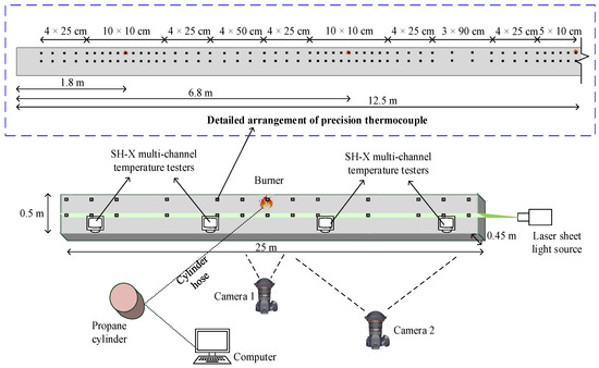 As shown in Figure 2, a 1/8-scaled urban utility tunnel was used for tests. The length of one individual fire prevention zone was L = 200 m, so the length of the scaled urban utility tunnel was 25 m. The box culvert structure was used to build the scaled urban utility tunnel. Each length of the individual segment was 2.5 m, and 10 segments were used. The cross-section size of the scaled urban utility tunnel was width × height = 0.5 m × 0.45 m. The top, bottom, back and both ends of the tunnel were made of fireproof board, and the fireproof-glass watching window was installed at the front of the tunnel. A fan was installed at each extreme end of the tunnel to facilitate the rapid delivery of fire smoke. The fireproof glass of each section of the box culvert structure was equipped with an available switchgear, which was convenient for the installation of the measuring instrument and for cleaning the internal wall of the tunnel. The heat release rate (HRR) of the fire source was precisely controlled using a propane burner measuring a size of 0.1 m × 0.1 m × 0.1 m. The HRR of the fire source was controlled using a gas turbine flow meter. A similar method of simulating a fire source was employed by previous researchers [23,24,25]. Propane gas fuel was ignited with an electric spark igniter, and then, the front window was closed immediately after ignition.