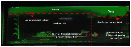 As shown in Figure 3, a nose-shaped smoke front was formed. This is because the smoke movement of tunnel fire belongs to the natural flow driven by thermal buoyancy, that is, the gravity current [30]. As the hot smoke gas spreads forward, the buoyancy becomes weak due to the heat loss in the front of the hot smoke. Thus, the effect of the viscous force increases. As time elapses, the spreading velocity of the smoke flow front is less than that of the main part of the gravity flow. The previous study proved that the velocity of the main part of the gravity flow is 1.3 times of that of the smoke flow front [30]. This indicates that the spread of hot smoke undergoes the inertia–buoyancy stage and the viscosity–buoyancy stage, accompanied by a change in smoke layer thickness [31]. In the viscosity–buoyancy stage, the smoke layer thickness is increased by the gravity flow, and an increasing pressure head is formed to overcome ceiling wall resistance.
