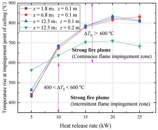 For the vertical plume in a tunnel, there are two critical temperature rises in analyzing the fire plume impingement behavior: ΔT0 = 400 K and ΔT0 = 600 K. For the temperature rise in the plume at the impingement point, namely ΔT0 < 400 K, 400 K < ΔT0 < 600 K and ΔT0 > 600 K, the corresponding fire plume is the buoyant plume zone, the intermittent flame zone and the continuous flame zone, respectively [8]. The buoyant plume belongs to the weak plume, while the intermittent and continuous plume belong to the strong plume [32].
