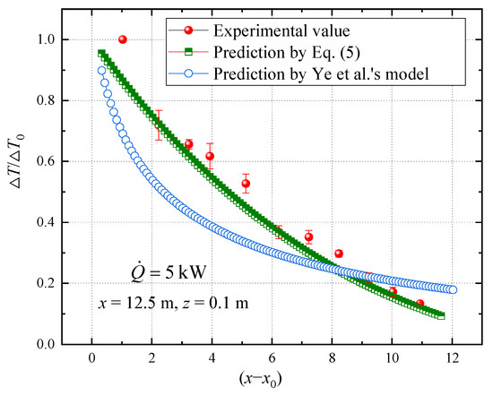 The longitudinal temperature rise of smoke, ΔT0, is attained by solving the transcendental equation, Equation (5), in accordance with the zero function [36]. At x = 12.5 m, z = 0.1 m and = 5 kW, Figure 7 shows the comparison of the measured data with the theoretical results of Equation (5) and Ye et al.’s model [11]. It was found that the currently proposed theoretical model formulated in Equation (5) is in better agreement with the experimental data. There are three possible reasons: first, the radiant heat loss is ignored in Ye et al.’s model [11], which leads to a large attenuation value of the temperature rise; second, the average thickness of the smoke layer is used to replace the thermal boundary thickness for calculation, so the systematic deviation caused by the fluctuation of the smoke layer’s thickness is avoided; third, the prediction of the longitudinal temperature rise of smoke depends on some characteristic parameters, and is determined based on the experimental condition. There are some deviations in these parameters between the current experiments and Ye et al.’s experiments [11]. Figure 8 shows the comparison of theoretical and experimental data on longitudinal temperature rise with two different positions (z = 0.1 and 0.2 m) and five different HRRs ( = 5, 10, 15, 20 and 25 kW) of the fire source. It was found that the theoretical values obtained via Equation (5) are in accordance with the experimental data.