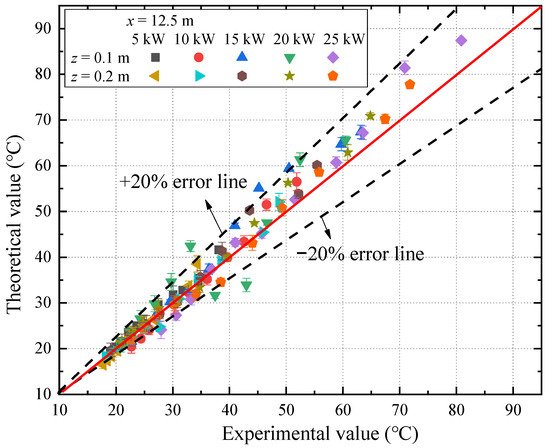 Substituting the theoretical value of the longitudinal temperature rise predicted by Equation (5) into the differential equation, Equation (9), the spreading velocity of smoke is obtained. As plotted in Figure 11, the theoretical value of the spreading velocity of smoke coincides well with the experimental value, and the relative error is less than 20%.
