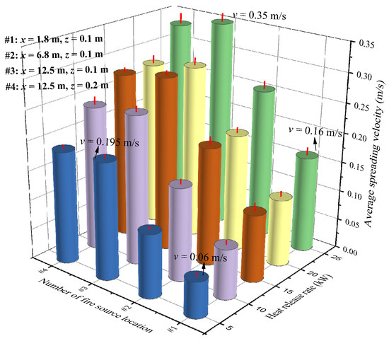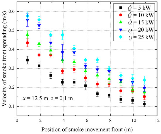 In the event of a utility tunnel fire, fireproof doors at both extremes are closed. The spreading velocity of smoke has a significant impact on evaluating the diffusion of toxic smoke, temperature distribution and personnel evacuation in the tunnel. At x = 12.5 m, z = 0.1 m, Figure 9 shows the instantaneously spreading velocity of smoke as a function of the HRR of fire source. It is found that the instantaneously spreading velocity decreases along the longitudinal direction. In general, at the half length of the tunnel, the spreading velocity is decreased by 50–60%. The temperature and spreading speed of smoke depend on air entrainment and heat dissipation. The air entrainment rate is much lower than the spreading velocity of smoke. With the spread of the smoke along the top ceiling of the tunnel, the accumulated heat loss increases, which leads to a decrease in the smoke temperature and spreading velocity.
