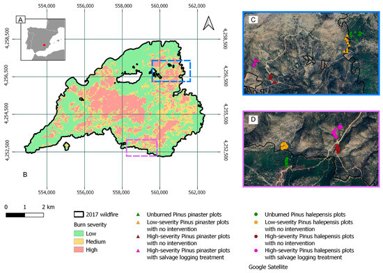 (A) Location of the Albacete Province in Spain; (B) the study area with the Yeste wildfire (black) and burn severity; (C) Pinus pinaster Aiton stands; (D) Pinus halepensis Mill. stands. Plots on each stand are classified as unburned, low-burn severity, high-burn severity, high-burn severity with salvage logging treatment, and background with the Google satellite. The reference coordinate system was ETRS89 (EPSG:25830).