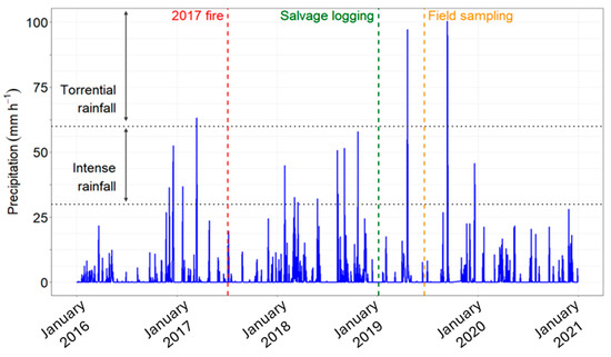Historical intensity of precipitation (mm h−1) for the research area (Yeste, Spain) from 2016 to 2021 [44]. The year of the fire is marked in red; the salvage logging treatment is colored in green, and the field sampling is in yellow.