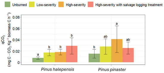 In Pinus halepensis stands, qCO2 showed a positive trend as burn severity increased (Figure 4). In Pinus pinaster stands, qCO2 increased with burn severity, but only the unburned and high-severity plots showed significant differences.