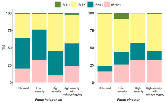 Species were classified based on their specific reactions to fire (Figure 6 and Table 3). After the fire, there was a higher proportion of resprouter species (R+S−) in the Pinus halepensis stands compared to the Pinus pinaster stands. For the Pinus halepensis stands, the only significant differences were noted between the low-severity and high-severity plots, in which the proportion of obligate seeders (R−S+) increased (from 22.56% to 53.29%, respectively) and the ratio of facultative seeders decreased from 32.38% to 10.44%, respectively. In the Pinus pinaster stands, the proportion of non-fire-adapted traits (R−S−) was significantly higher in the low-severity plots (8%) than for the rest of the zones (0.92% for unburned, 0.49% for high-severity, 1.62% for high-severity with salvage logging treatment). In addition, the proportion of obligate seeders (R−S+) was lower in all fire-affected plots compared to the unburned plots, with a statistically significant reduction. No significant differences were found in the proportion of facultative seeders (R+S+).