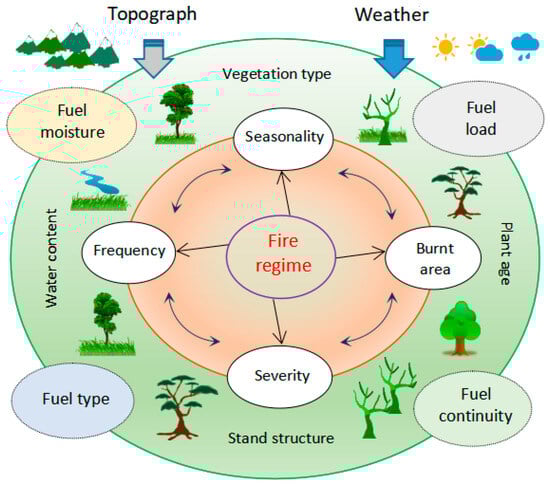 Initiated in the early part of last century, forest fire ecology is dedicated to exploring the ecological consequences and related issues of forest fires, with the emphasis placed on understanding the relationships and interactions among forest fires, forest ecosystems, and the environment [17,18,19]. Following the advancement of forest fire ecology, ecologists have tracked the pattens of fire characteristics and behaviors, return time, and the frequency of occurrence in the forests. The ecological and economic roles of the fire ecological factors have been evaluated [1,20,21,22]. To date, the concept of fire regimes has been extended to describe fire and its role in the ecosystem, allowing us to coordinate the relationship between fire and the ecological environment [21,22,23]. For forests with different vegetation distributions and those undergoing certain types of fuel treatment, quantifications were also made to the fire occurrence frequency, burning areas, and intensities, as well as fire severity, highlighting the dynamic nature of forest fire ecology [21,22,24,25,26].