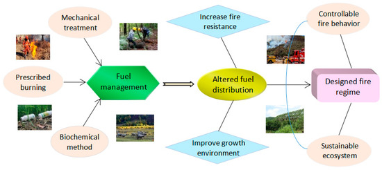 Fuel moisture content, load, and spatial distribution of fuels in different forests constitute diverse fire regimes and behaviors at each spatial level, as illustrated in Figure 1. By adjusting the fuel’s physical properties, quantities, and distribution patterns, existing vegetation types and structures in forests or grasslands can be maintained in a more sustainable way [22,39,40,41,42,43]. It has been recognized that, the reduction in potential spread rate and burning intensity of wildfires implies lessened fire impact to the local landscapes and the built environment, allowing for positive feedback to the atmospheric circulation that both plants and human beings rely on [22,39].