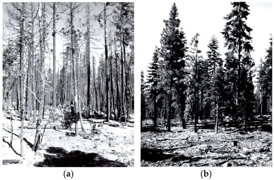 A comparison of the status of Pinus ponderosa forests in Laren National Park, California, after the fire in 2002; the left-hand side photo (a) reflects serious damage in the untreated areas and the right-hand side photo (b) demonstrates that the pine trees in the shaded fuelbreaks were almost untouched during the fire [8].