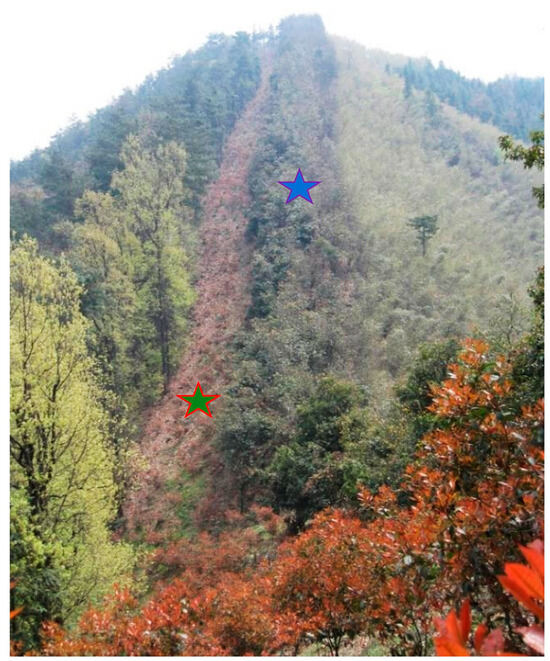 Typical layout of green fire barriers with the integration of evergreen big arbor species and a small arbor species. The green belts are located on the ridge of Wuziling, Tianmu Mountain, Zhejiang Province, and the strip with dark green color (labeled by blue star) is a S. superba stand, which was built in the late 1980s. This fire separation facility was expanded in recent years by densely growing Photinia × fraseri Dress in the open space at a width of about 15 m (labeled by a red and green star).