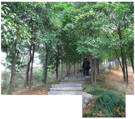 The unique stand of S. superba species has not only been used for preventing forest fires due to human faults, but also serves as scenery in Menggutang Cultural Park, Qiandao Lake Town, Chun’an County, Zhejiang Province. Stone steps were built inside the stand as a path for tourists and a passage for firefighters to approach the annex forest in a state of emergency. An evergreen species of grass, Ophiopogon bodinieri H. Lév., was planted along the stone steps (shown in the zoomed-in window). This species contains high water content in all seasons and is able to trap fine surface fuels. Because of its loose structure and high water content, it can effectively prevent fires caused by dropped cigarette butts.