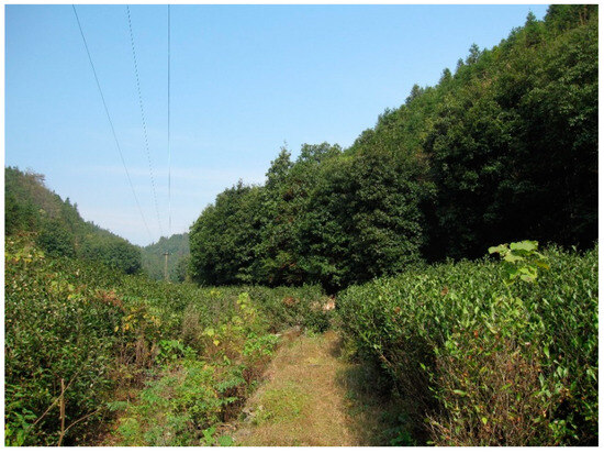 Evergreen broad-leaved tree species, Camellia sinensis (L.) O. Ktze., densely grew in the band areas along the power transmission line. Located in the Jieshou Forest Farm, Chun’an County, Zhejiang Province, which was a replacement of the previous all-removed fuelbreaks built for preventing fires caused by faulty power lines. The reuse of the open land by planting a fire-resistant species represents the integration of the demand for forest fire prevention with economic output and ecological conservation.