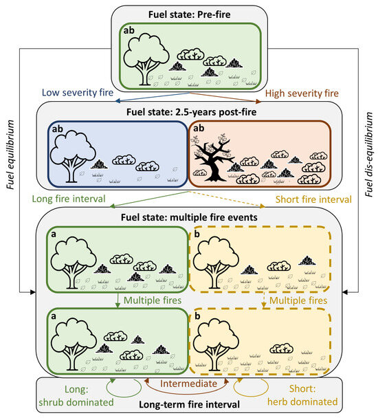 In the model, we propose that state-changes are contingent on shrub and herb recruitment following repeated short-interval fire. It is likely that future fire regimes will oscillate between periods of recurrent short- or long-interval mixed-severity fire based on climatic limitations on fuel growth and subsequent fire feedbacks, with concurrent changes in fuel structure and array. However, the targeted application of short-interval fire around high value assets through prescribed fire and/cultural burning, on top of wildfires, will undoubtedly occur in many locations. The state change shifts proposed by the model would be particularly relevant to these areas where recurrent short-interval fire dominates the landscape.