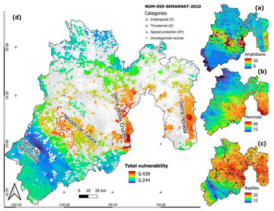 3.2. Vulnerability of Amphibians, Mammals and Reptiles