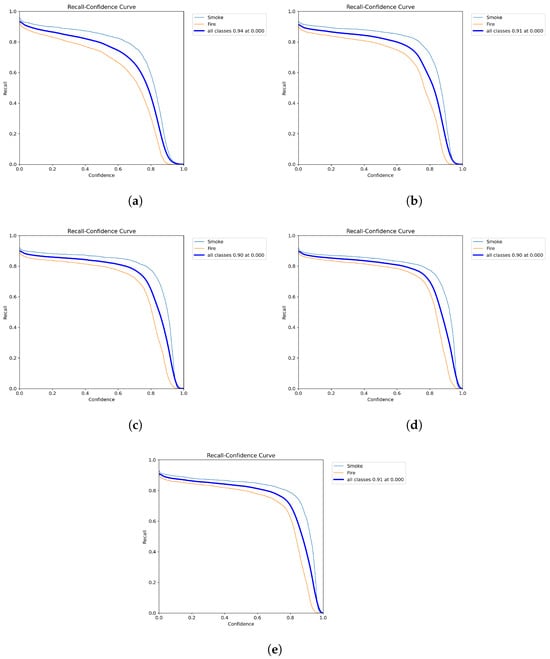 Recall curves of YOLOv8 models: (a) YOLOv8n, (b) YOLO v8s, (c) YOLOv8m, (d) YOLOv8l, (e) YOLOv8x.