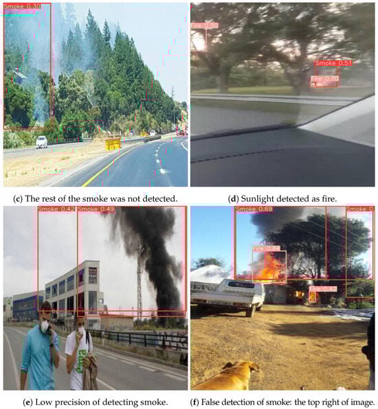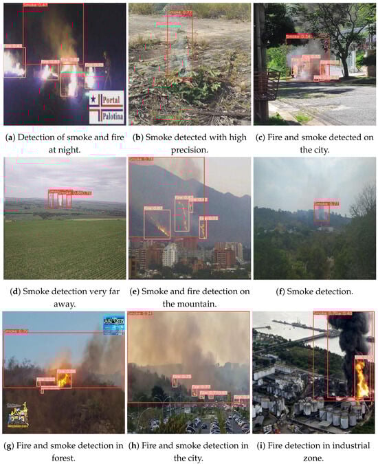 Figure 5 presents some of the detected fire and smoke using the best model (YOLOv8x) on the test set. As we can see, the model perfectly detects the smoke and fire in different conditions (night, day, forest, street, etc.). For example, in the first images, (a) the model detects the smoke and fire at night time with a high confidence score of 0.83.