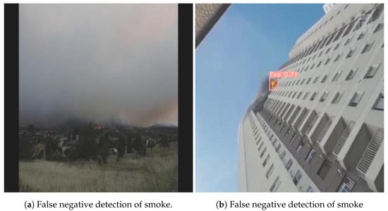 For Figure 5d,f,g, the smoke appears with a low contrast and is far; the model provides accurate detection with a confidence score reaching 0.83. In the same way, for Figure 5c,e,h, fire and smoke are perfectly detected in different places (forest and street) with a high confidence score of 0.9.