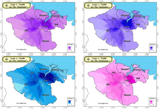 In this study, demographic data comprise four factors. Factor 1 () represents inhabitant density, Factor 2 () represents elderly inhabitant density, Factor 3 () represents elderly living alone inhabitant density, and Factor 4 () represents young age inhabitants’ density. Factor 1 (inhabitant density) is calculated by dividing the number of inhabitants in each village () by the area of each village (). Factor 2 (elderly inhabitants) is defined as the number of elderly inhabitants in each village () divided by the area of each village (). Factor 3 (elderly living alone inhabitants) is defined as the number of elderly living alone inhabitants in each village () divided by the area of each village (). Factor 4 (young age inhabitants) is defined as the number of young age inhabitants in each village () divided by the area of each village ().