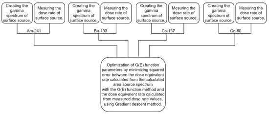 We calculated the dose rate from the energy-calibrated gamma spectrum using a spectrum dose conversion operator. This method is known as the G(E) function method [44]. The G(E) function method uses a spectrum dose conversion operator function to calculate the dose rate from the spectrum by multiplying the count rate in each energy channel with the corresponding value of the function and then summing the results.