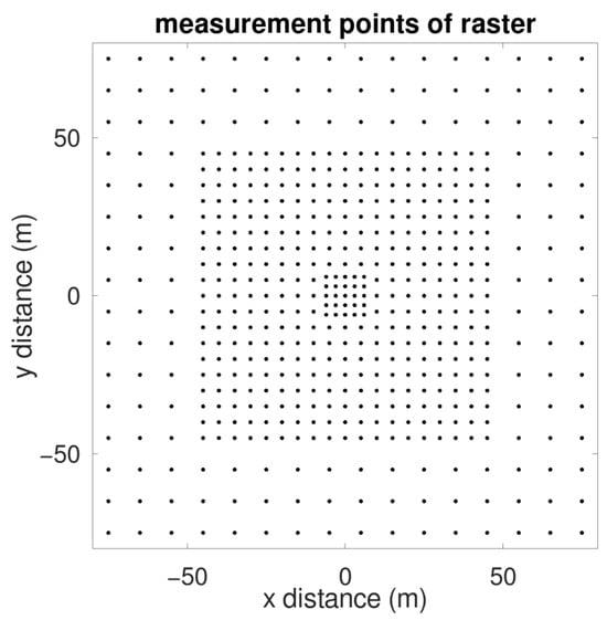 The measurement points were organised in a grid pattern. Throughout the measurements, the respective point source under examination was positioned precisely at the designated grid point, situated at ground level. It is important to note that for all calculations, we assumed uniform surface radioactivity across the entire measurement area.