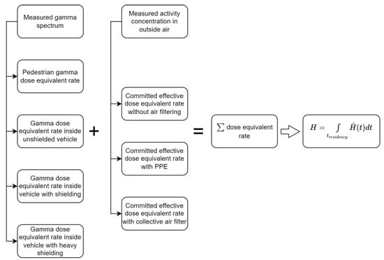 In the present study, the effective dose was calculated from external exposure measured by ambient dose equivalent rate meters H*(10) and from internal exposure due to inhalation measured by an online aerosol and iodine monitor [24]. For the prediction of an injured person’s effective dose caused by external exposure, the authors used the outside measured value with a Geiger–Müller (GM) tube-based detector and a scintillation-type detector compensated by the shielding effect of the vehicle and multiplied by the time of exposure. The advantage of the GM tube is that it works reliably even with extremely high gamma radiation (100 Sv/h). The scintillation detector was used for isotope identification and creating a response matrix, which is needed to apply the correct attenuation function for the shielding efficiency calculation. The shielding of the vehicle was characterised with different radioactive sources. The committed effective dose due to inhalation is calculated over a 50-year period after the intake, E50. The E50 cannot be directly measured: it can only be calculated [25]. The online aerosol and iodine monitor sucks in air and measures the alpha, beta, and gamma activity concentration in aerosol and in an activated carbon filter, in particular the radioactive iodine and caesium. The algorithm calculates the intake activity using the occupation time, and the internal effective dose coefficient (dose per intake coefficient) estimates the effective dose to the injured person due to inhalation for each route with and without respiratory protection [26]. The authors used a Phoswich-type scintillation detector to measure alpha, beta, and gamma activity; similar technology was also applied and discussed in Fukushima, Japan [27].