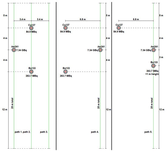 The measurements were conducted within a 150 × 150 m flat area devoid of any land objects, as shown in Figure 7. Throughout the measurement process, detectors were positioned centrally within the area, precisely 1 m above the ground level. Point-type sources were systematically placed, measured, and subsequently relocated to new positions for each measurement iteration. Spectra were recorded individually for each source and each source position, ensuring meticulous data collection at every measurement point. During their research, the authors took into account the material elaborated on in several scientific works [61,62]. In all cases, the detector and the vehicle were placed at point 00.