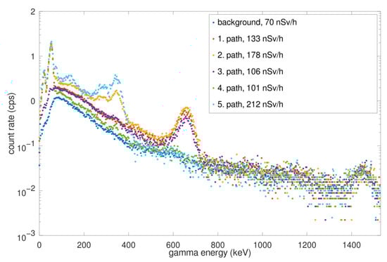 To be able to conduct continuous spectrometry measurements, a scintillation detector called RadNDI was used as well [51]. The RadNDI device combines the capabilities of field and laboratory instruments. This detector has a 2″ × 2″ NaI(Tl) scintillation crystal (18 keV–3 MeV gamma energy), 50 × 1 mm B-10 polyester + Zn/S(Ag) scintillation material (0.025–10 MeV neutron energy). The gamma spectra were evaluated using RadSpect spectrometric evaluation software v. 3.5.7 [52]. A picture of the scintillation detector can be seen in Figure 5. This device automatically provides the measured ambient dose rate, the spectrum, the identified isotopes, and the estimated activity. All measured and calculated data are associated and stored with the actual time and coordinates.