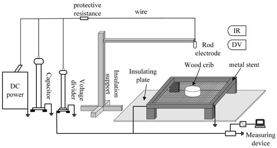 The rod–plate gap breakdown test device under vegetation combustion is shown in Figure 1. The test device is composed of a DC power supply, capacitor, voltage divider, protection resistance, rod electrode, vegetation stack, metal plate, and breakdown voltage acquisition device. In the experiment, wooden crib fire was used as the fire source, and the influence of vegetation flame intensity on the gap breakdown voltage was compared and studied. The test wooden crib is approximately circular and placed in a regular pine bar of 2 × 2 × 7 cm.