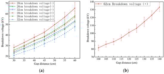 The breakdown voltage test values for different sizes of wooden cribs. (a) The breakdown voltage test values of the small gap; (b) the breakdown voltage test values of the long gap.