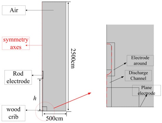 The distance, h, between the rod electrode and the wooden crib is set according to different electrode heights under specific test conditions. The radius of the rod electrode is 1.5 cm and the length is 9.5 cm. An airbag with a radius of 500 cm and a height of 2500 cm is set as the outer boundary. The geometric structure of the simulation model is shown in Figure 4. In this paper, the initial electric field generated by the rod electrode is a constant electric field, the air boundary area is zero charge, and the ground potential is zero. The side boundary and upper boundary of the model are set as open boundary, and the lower boundary of the model is adiabatic.