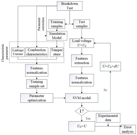 The prediction process is shown in Figure 7. The SVM model is trained by using the multi-physical field coupling model established above. Taking the gap length L0 as an example, the breakdown voltage of the gap is U0. The breakdown voltage under the gap is divided into breakdown interval [U0, (100% + σ%)U0] and tolerance interval [(100% − σ%)U0,U0]; σ is the difference between the maximum and minimum values of the test data and the average values mentioned above. The voltage values of the tolerance interval and the breakdown interval are loaded on each air gap in the sample set, and the simulation calculation is carried out. The input characteristic quantities, such as space temperature, leakage current, and wooden crib combustion characteristics, are extracted and normalized to eliminate the influence of dimension. The calculation formula is as follows: