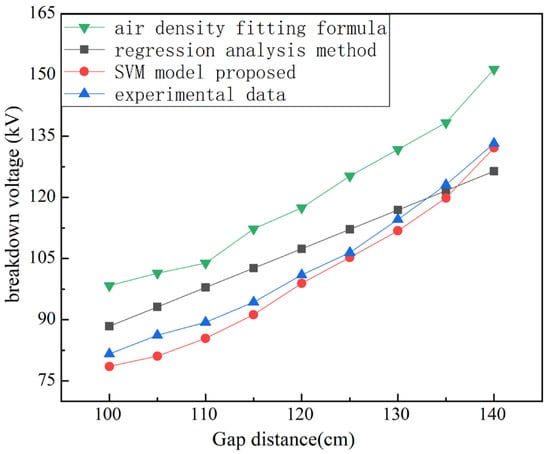 The comparison results are shown in Figure 9. The average error of the breakdown voltage prediction using the temperature–air density fitting formula method is 14.7%, and the average error of the breakdown voltage prediction result using the regression analysis method is 7.6%; thus, the SVM prediction model is effective. The average error of the breakdown voltage prediction result is 3.2%. The breakdown voltage of the long gap under flame conditions is not directly linear with the breakdown voltage of the small gap. It is difficult to achieve a good prediction effect by using the small gap data directly to predict the breakdown voltage of the long gap. Compared with these two methods, the prediction error of the SVM model is relatively low, thereby indicating the good prediction effect of the model proposed in this paper for long gap distances.