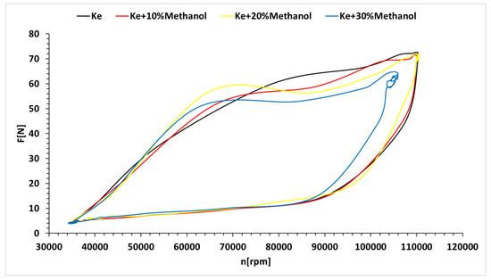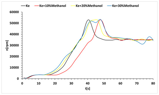 Figure 5 shows that as the methanol concentration increases, the starting time increases too. For the first concentration of methanol (Ke+10%M), the starting procedure is relatively stable. As the concentration increases, at Ke+20%M, the starting time is lower but the maximum rpm was hard to maintain, as it can be seen in the summit of the yellow line. As the engine reached the yield regime, rpm is more oscillating than in the case of Ke. The starting procedure presents large difficulties in the case of 30% methanol, and maximum rpm cannot be held by the engine. After reaching yield regime, the rpm oscillations increased even more.