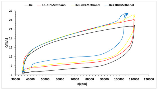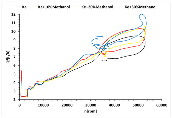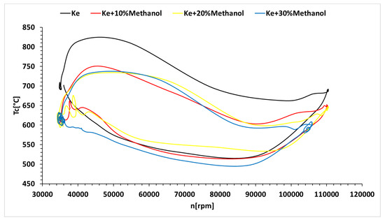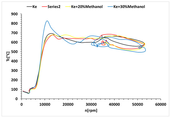 As for the fuel debit, it can be observed in Figure 7 that it increases while the methanol concentration increases throughout the entire starting procedure. Even more, for Ke+30%M, an anomaly compared to the engine’s working law can be observed when the max rpm is attempting to be reached. This can also be assessed from Figure 6 where the combustion temperature for the blend containing Ke+30%M is very high and very instable during the entire starting procedure.