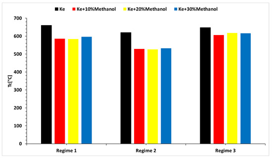 Figure 11 visually presents the temperature fluctuations in front of the turbine across all three operating modes and various tested fuel combinations. Upon analyzing Figure 11, it can be deduced that the engine remained safe and intact since the turbine’s maximum temperature of 800 °C was neither reached nor surpassed. Notably, in the idle mode, the temperature diminishes with an increase in alcohol concentration, attributed to the inherent instability of the idle regime. At higher regimes, combustion temperatures decrease significantly as the methanol concentration rises in the tested fuel blends. The temperature variation, correlated with other parameters, influences specific fuel consumption, combustion yield in the combustion chamber, and thermal yield.