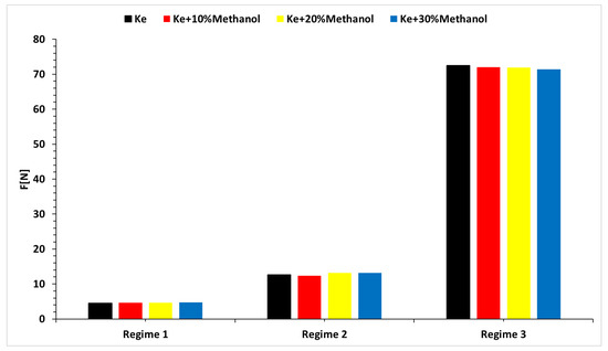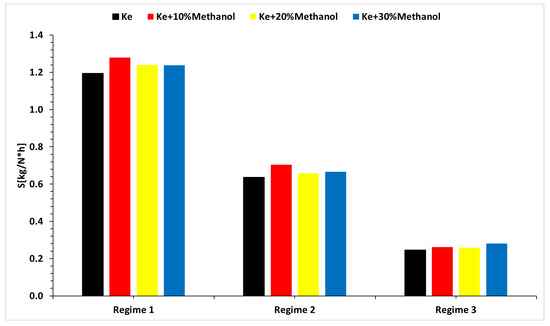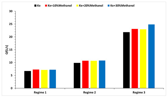 Figure 12 illustrates the variation in consumed fuel flow in liters per hour, revealing a noteworthy increase across all three modes and tested fuel blends. Figure 13 depicts the thrust variation (F) based on the regime and tested blends. It is noticeable that thrust variations are minimal for regimes 1 and 2 but decrease during regime 3. Moreover, thrust diminishes with higher alcohol concentrations. The overarching conclusion drawn from these figures is that the engine’s functionality and integrity were not compromised.